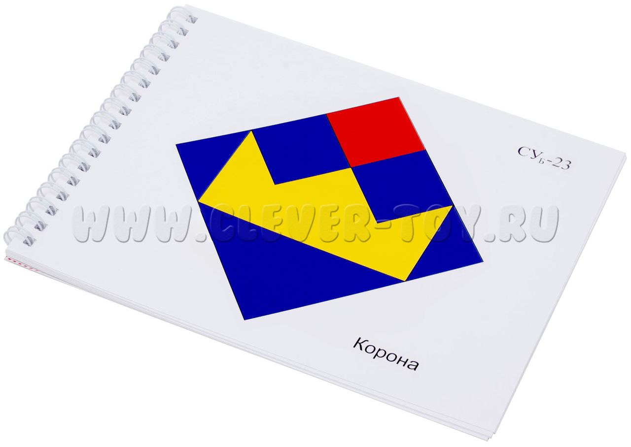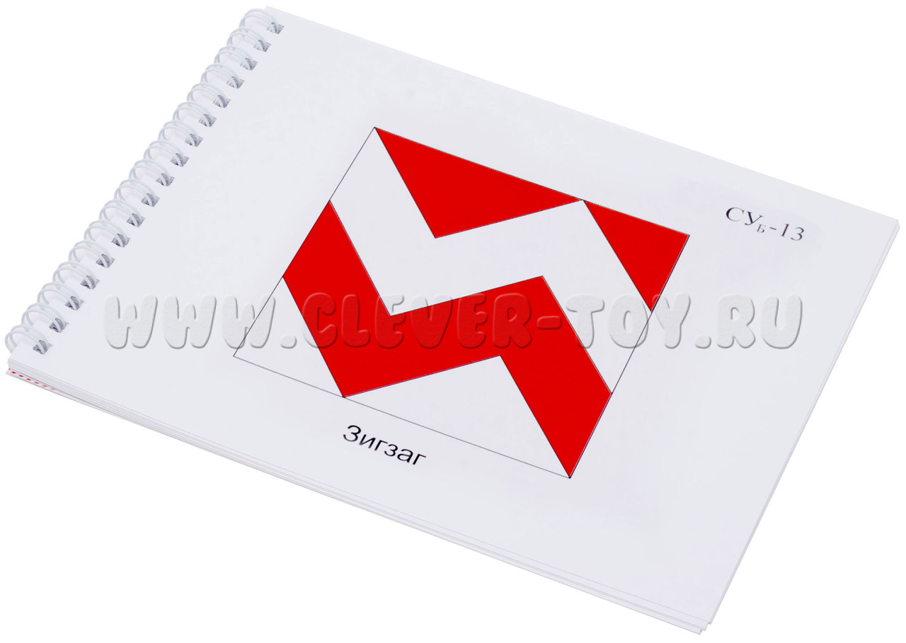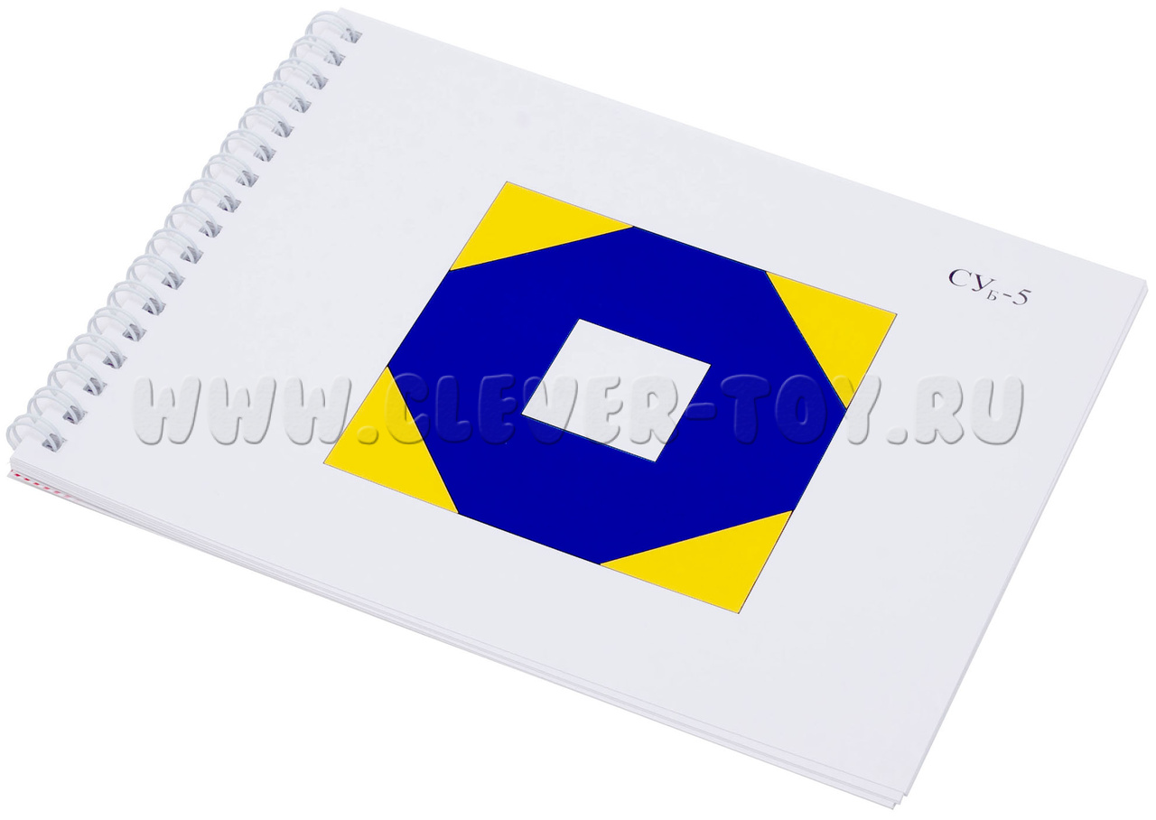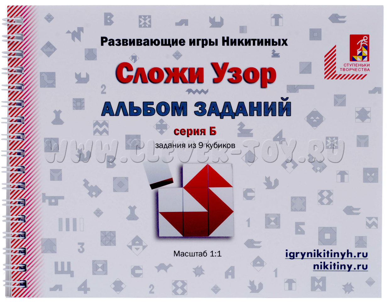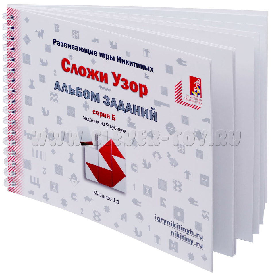 Альбом с заданиями к игре "Сложи узор" серия Б содержит 24 цветных схемы для сборки фигур из 9 кубиков, расположенных по принципу «от простого к сложному». Каждое задание расположено на отдельной странице в масштабе 1:1.