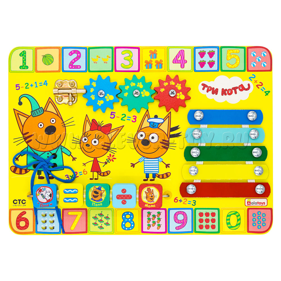 Красочный и позитивный бизиборд "Учим цифры" (лицензионный бренд "ТРИ КОТА"), созданный по методике Монтессори, обучает счету, знакомит с музыкальными звуками, цветами радуги; развивает навыки шнурования, мелкую моторику, воображение, логику и речь. Герои любимого мультфильма обязательно помогут в этом!