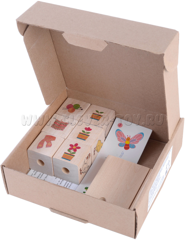 - 6 кубиков (4*4*4 см) с изображениями различных событий, разделённых на три последовательных состояния (ДО и ПОСЛЕ);