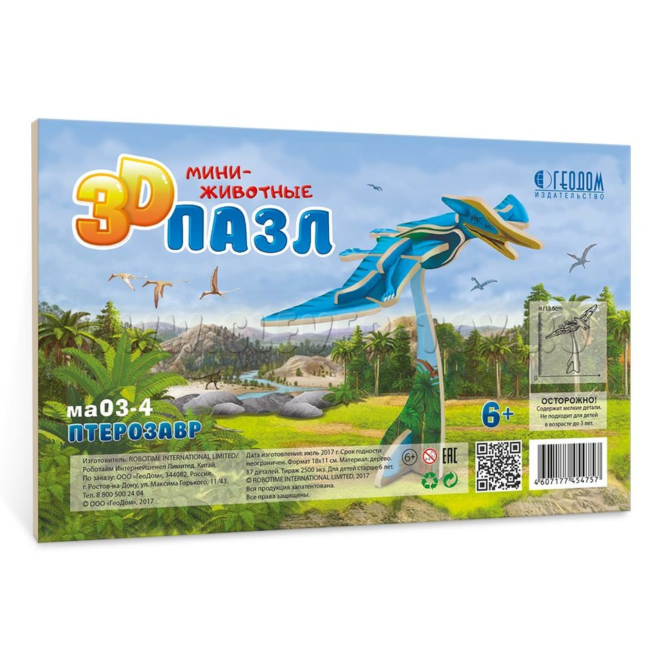 Пазл деревянный 3D. Птерозавр. Серия Мини-животные. Размер 11,5х18,5 см.