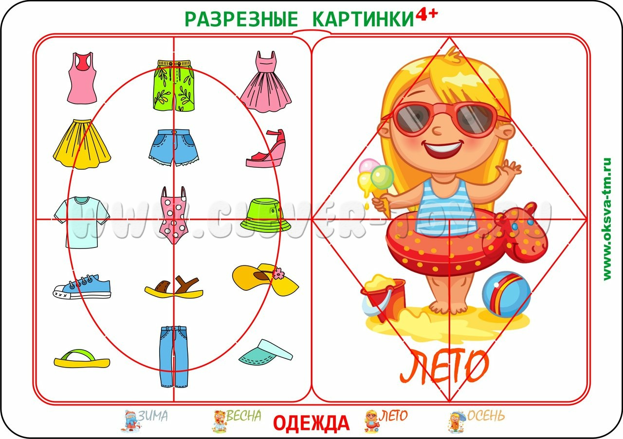Количество частей, на которые распадаются рисунки: для времен года – 7 штук, для сезонной одежды – 8 штук. Все части подобных рисунков одинаковые.