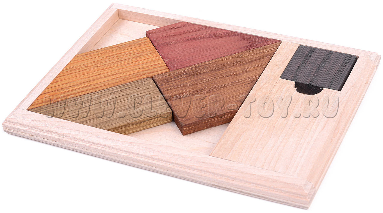 Уложить в квадратную рамочку все 5 предлагаемых элементов (четыре прямоугольных трапеции и один квадрат). Элементы можно как угодно перемещать, поворачивать и переворачивать, но нельзя накладывать друг на друга. Свободное место в два раза больше площади квадратного элемента, и когда вы решите эту задачу, свободная площадь еще останется.