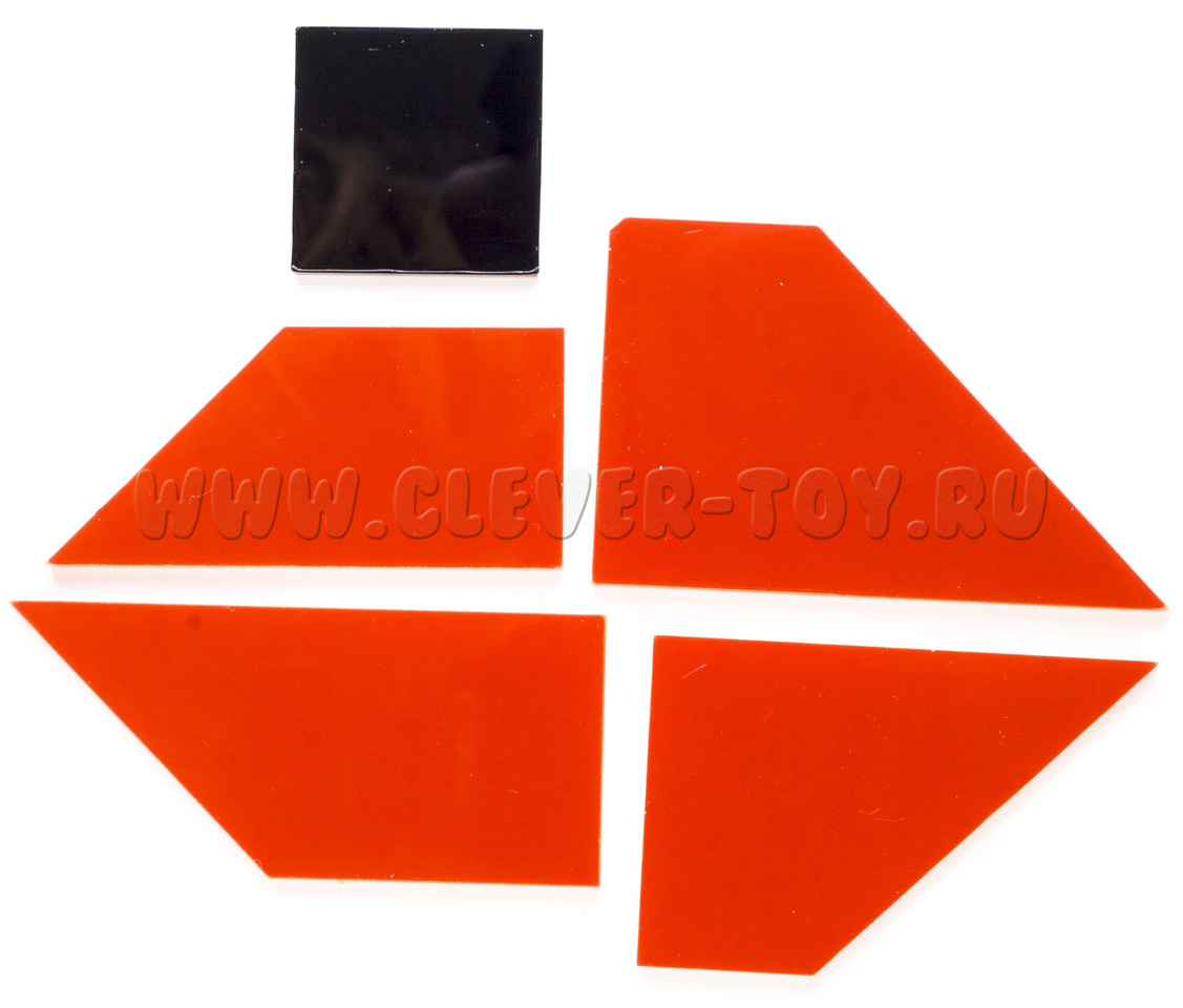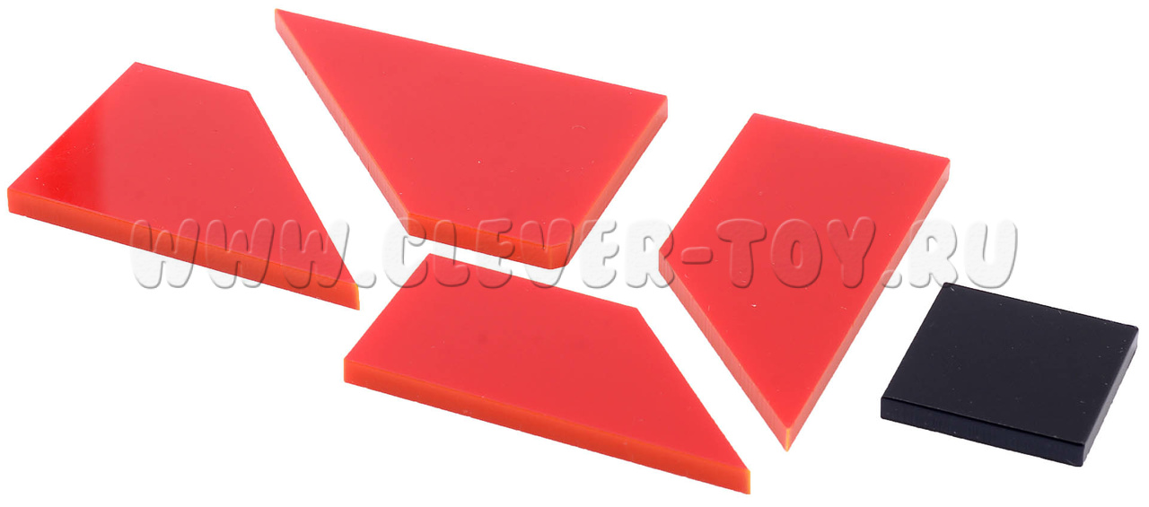 Уложить в квадратную рамочку все 5 предлагаемых элементов (четыре прямоугольных трапеции и один квадрат). Элементы можно как угодно перемещать, поворачивать и переворачивать, но нельзя накладывать друг на друга. Свободное место в два раза больше площади квадратного элемента, и когда вы решите эту задачу, свободная площадь еще останется.
