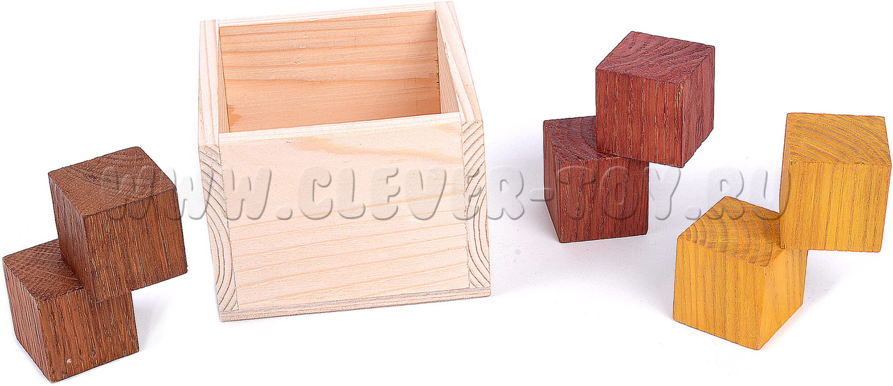 Уложить в квадратную коробочку прилагаемые элементы. Их всего лишь три (каждый элемент - это сдвоенные кубики),но, тем не менее, достичь цели довольно сложно.