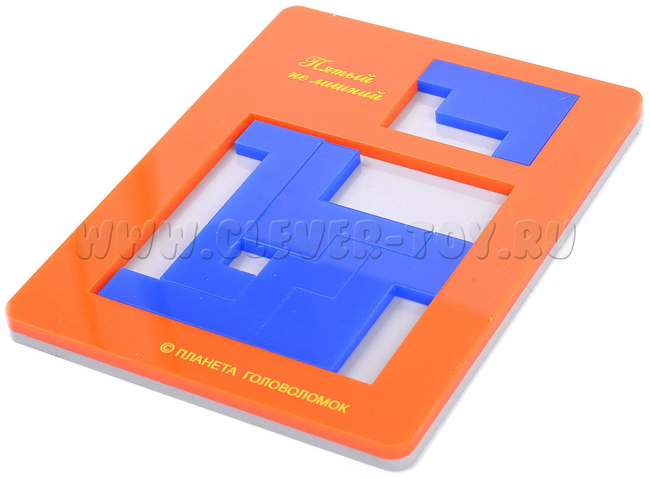 Нужно разместить все элементы в коробочке. Как обычно в таких задачах, элементы можно как угодно поворачивать и переворачивать, но нельзя накладывать друг на друга. При этом общая площадь всех элементов составляет около 80% площади квадратной ниши, так что свободного места для размещения всех пяти элементов достаточно. Однако, задача не так проста. Известно единственное решение этой головоломки.
