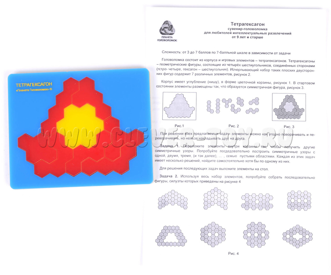 Головоломка основана на использовании тетрагексагонов - геометрических фигур, состоящих из четырех шестиугольников, соединенных сторонами. Главная задача заключается в построении разнообразных фигур по предложенным заданиям.