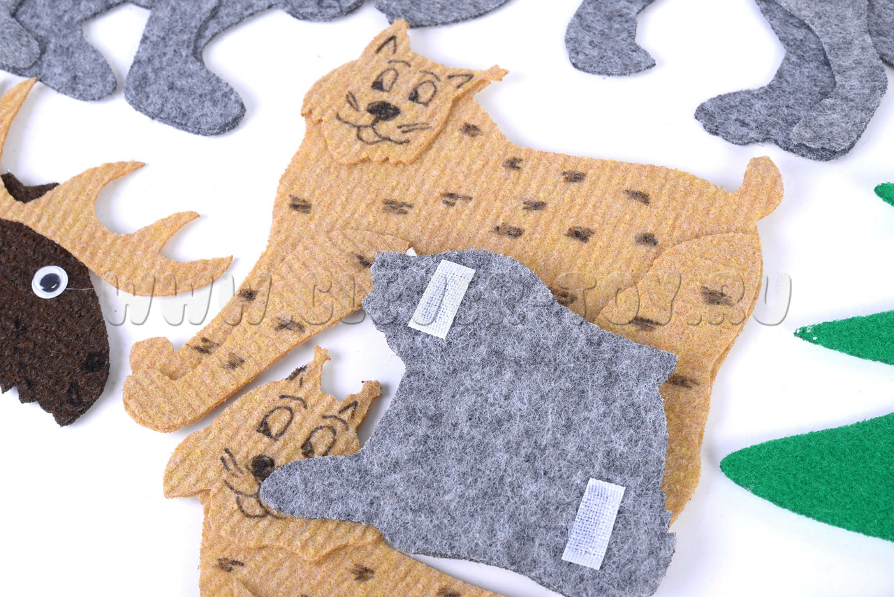 Набор "Дикие животные" - это ещё и динамический театр на плоскости! Вы и ваш малыш сможете придумать и поставить свой первый спектакль с участием ковролиновых героев, дать им разный голос и характер, разыграть с их помощью любимые сказки.