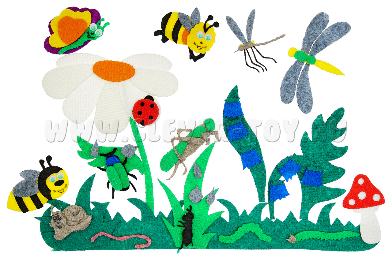 • насекомые: бабочка, гусеница 2 шт., улитка, оса, пчела, божья коровка, кузнечик, стрекоза, комар, жук, муха, муравей, червяк;