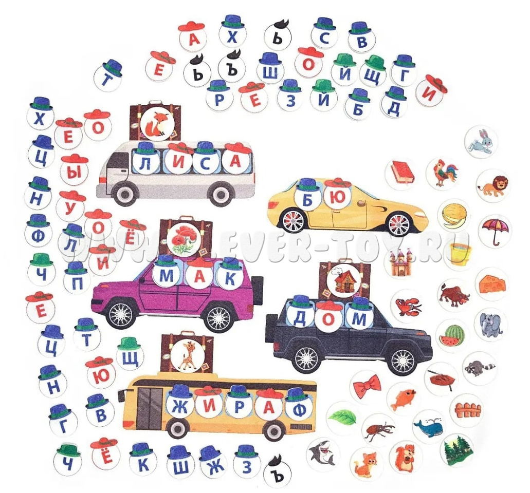 В комплекте вы найдёте красочное панно размером 60×80 см с изображением трёх домиков в городе букв. Также есть игровые элементы в форме кружочков с красными и синими буквами, игровые элементы в виде машин и автобуса, а также фигурки дидактических картинок.