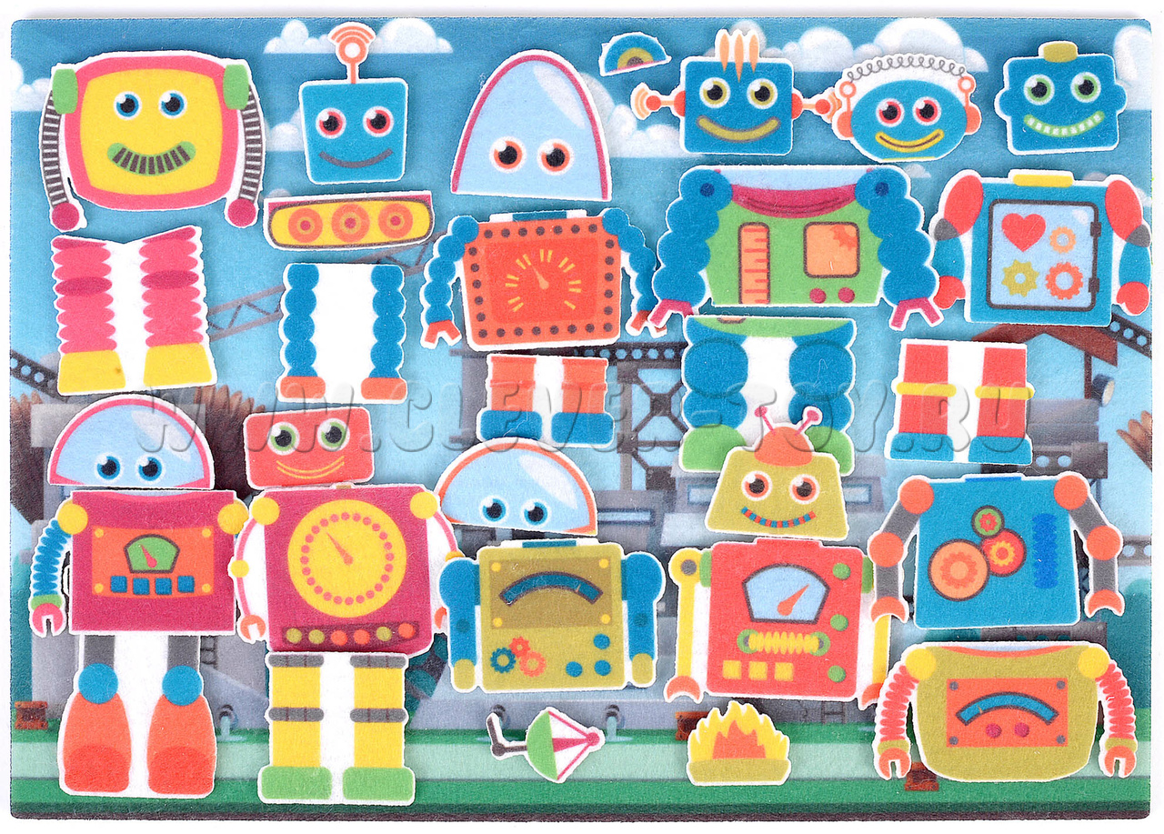 • элементы роботов – головы, туловища, ноги, всего можно создать от 4 до 6 разных роботов; все детали можно соединять друг с другом, поэтому число итоговых вариантов дизайна роботов увеличивается;