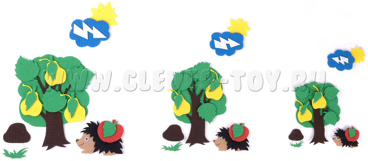 - дерево, солнышко, тучка с молнией, корзинка, ёжик маленького, среднего и большого размера (по три шт. каждого вида);