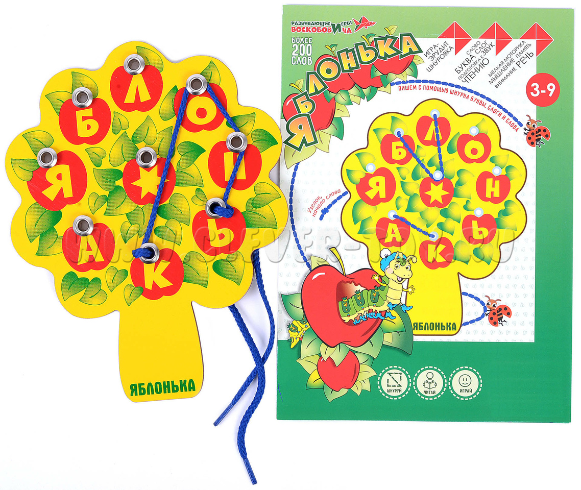 Игра - шнуровка "Яблонька" продолжает серию игр Воскобовича "Шнур-грамотей". Предназначена для детей в возрасте 3-8 лет.