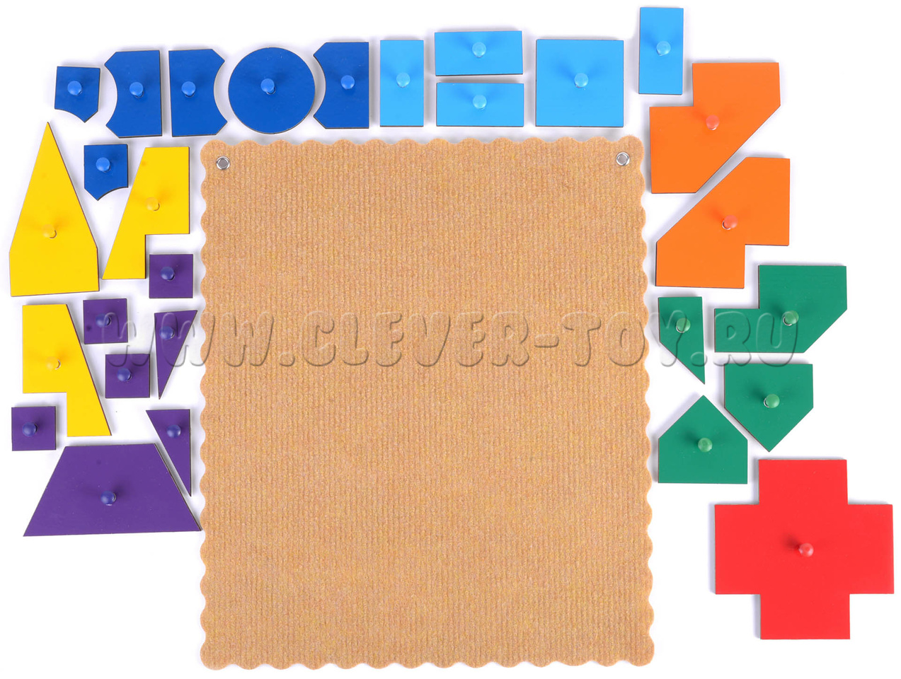 Крупные, яркие деревянные детали игрового пособия разделены на различные геометрические фигуры разной формы и величины, которые образуют 7 разноцветных крестиков. Из этих деталей ребёнок с помощью методических рекомендаций и подсказок взрослого может складывать фигуры: