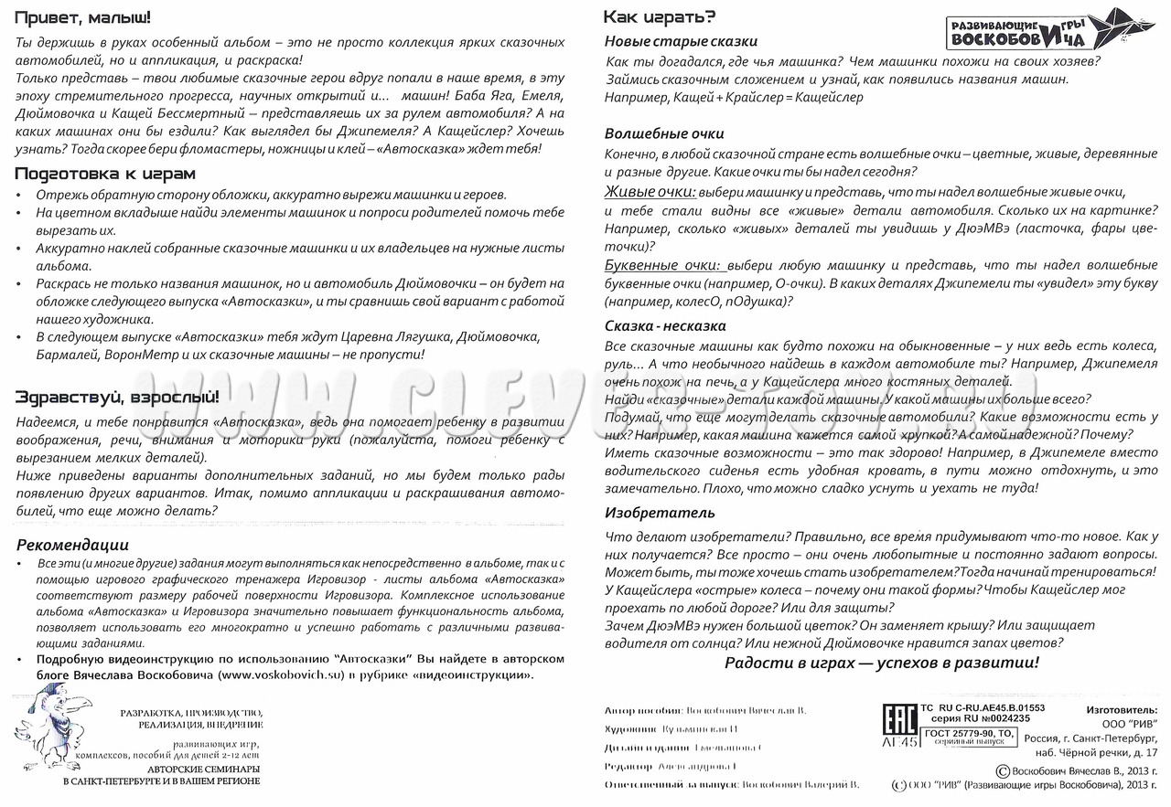 Подробную видеоинструкцию по использованию «Автосказки» Вы найдете в авторском блоге Вячеслава Воскобовича (www.voskobovich.su)в рубрике «видеоинструкции».