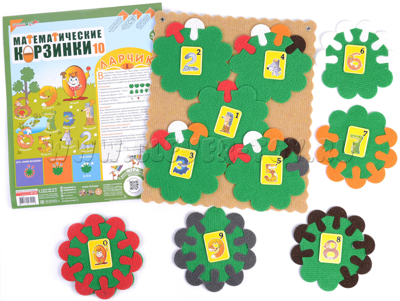 Игру «Математические корзинки Ларчик 10» можно использовать как самостоятельное демонстрационное игровое пособие, так и с развивающими играми и пособиями «Коврограф Ларчик», «МиниЛарчик», «Математические корзинки 5 и 10», Набор корзинок «Дцать», «Математические корзинки Ларчик 100», «Набор цифр и знаков» (дерево, ковролин).