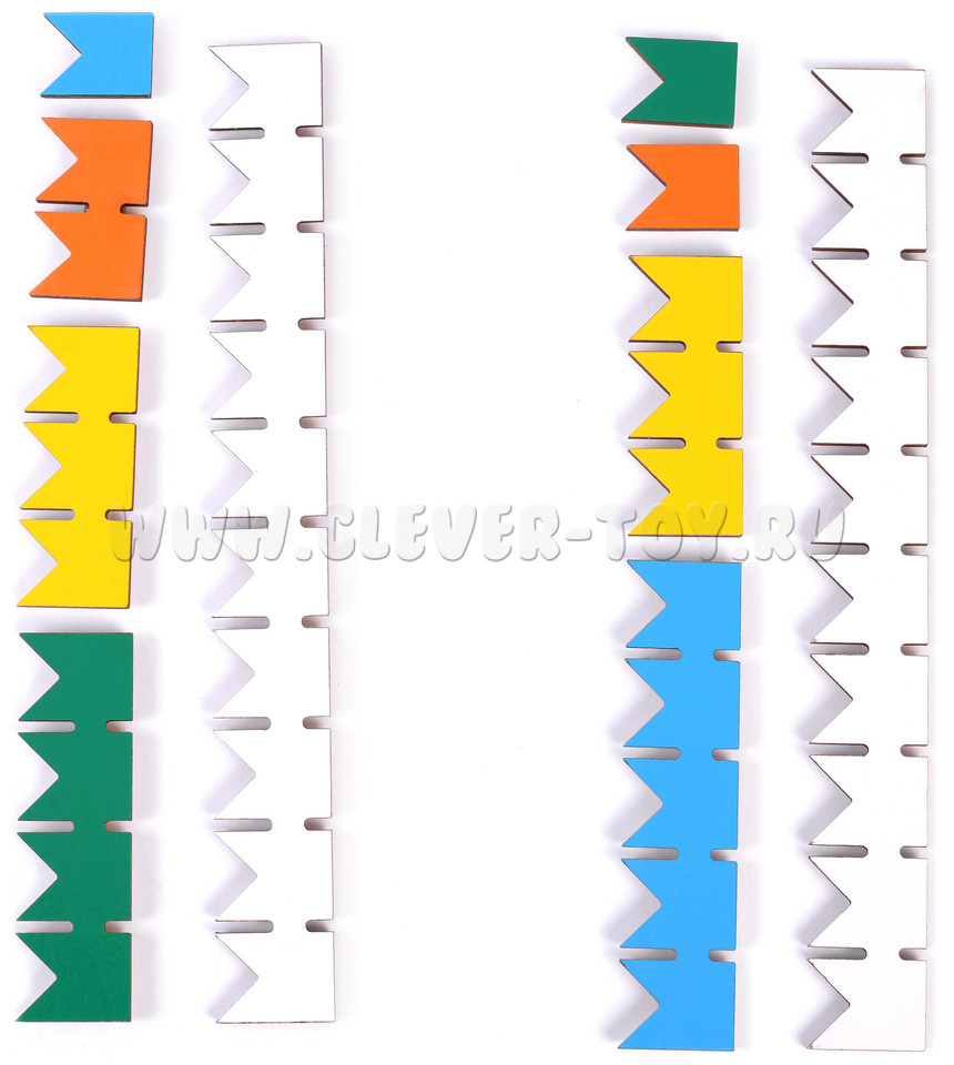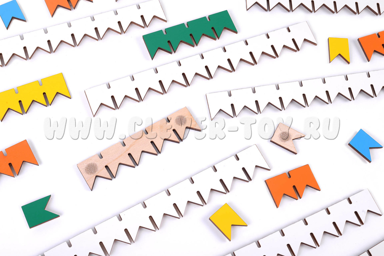 • одинарные флажки (фанера) – 15 шт. (красные 1 шт., оранжевые 2 шт., жёлтые 3 шт., зелёные 4 шт., голубые 5 шт.)