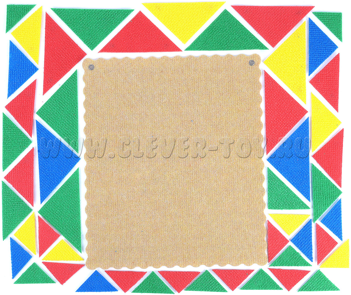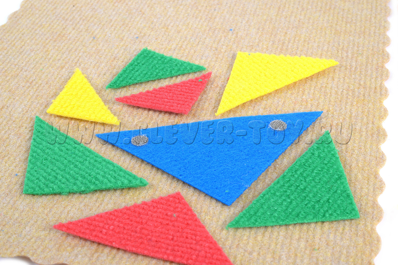 Состав игры: Треугольники 3-х размеров - 48 штук (красные- 16 шт., зелёные - 16 шт., синие - 8 шт., жёлтые - 8 шт.) Подложка (ковролин 29,7 х 35 см.) с двумя люверсами по верхним углам.