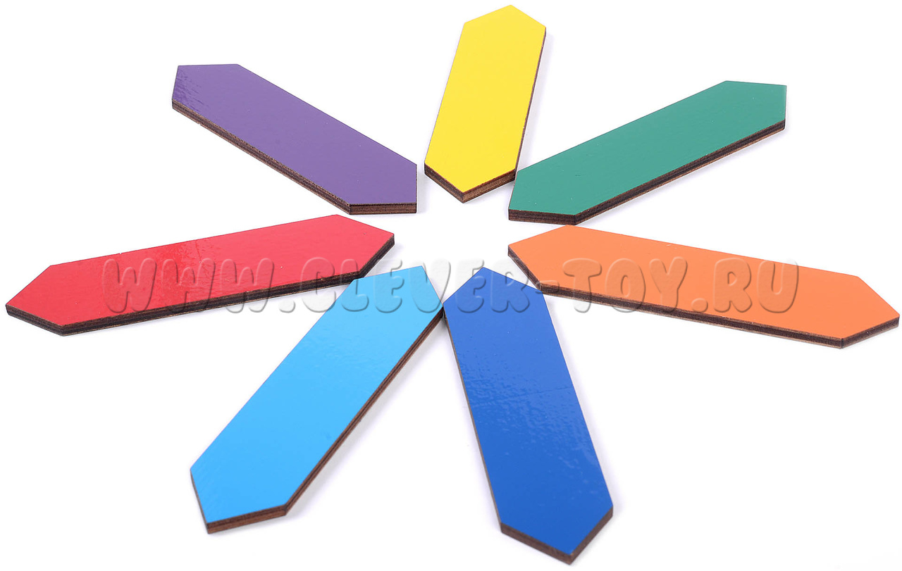 • двусторонние палочки для складывания цифр, выполнены из дерева, окрашены яркой и безопасной краской; с одной стороны они окрашены в цвета радуги, с другой – в любой другой цвет;