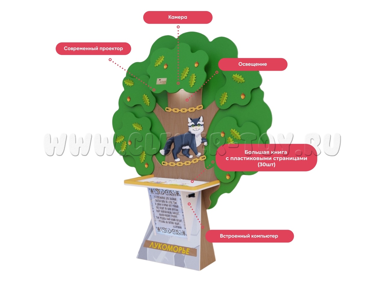 Стилизованная стойка, выполненная в виде интерактивной книги, - это уникальный образовательный инструмент для программ дошкольного образования. Крупные пластиковые страницы, на которые проецируются яркие иллюстрации и текст, позволяют детям не только знакомиться с литературой, но и активно участвовать в процессе чтения.