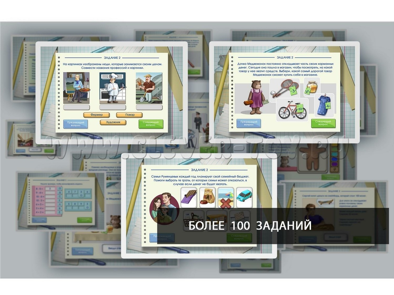 В каждом блоке содержится комплекс уроков на различные темы. В процессе обучения ребенок ответит на множество вопросов по курсу, решит задачи с расчетами, поработает с графиками, произведет денежные операции, разберет кейсы и отгадает множество кроссвордов и загадок.