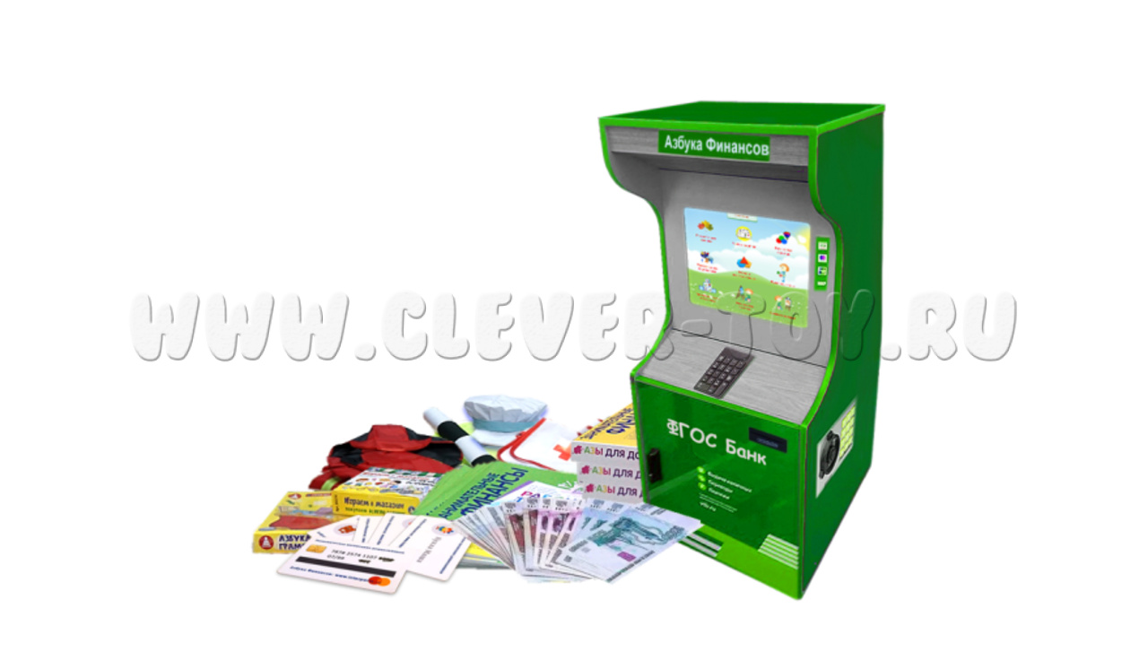 В отличие от мобильных версий комплекса данная модель включает условно-мобильный банкомат, который оборудован высокопроизводительным компьютером и монитором. Это не только усиливает реалистичность образовательных игр и занятий по финансовой грамотности, но и обеспечивает возможность автономного использования всего комплекса без необходимости подключения к интерактивной доске, благодаря встроенному монитору банкомата.