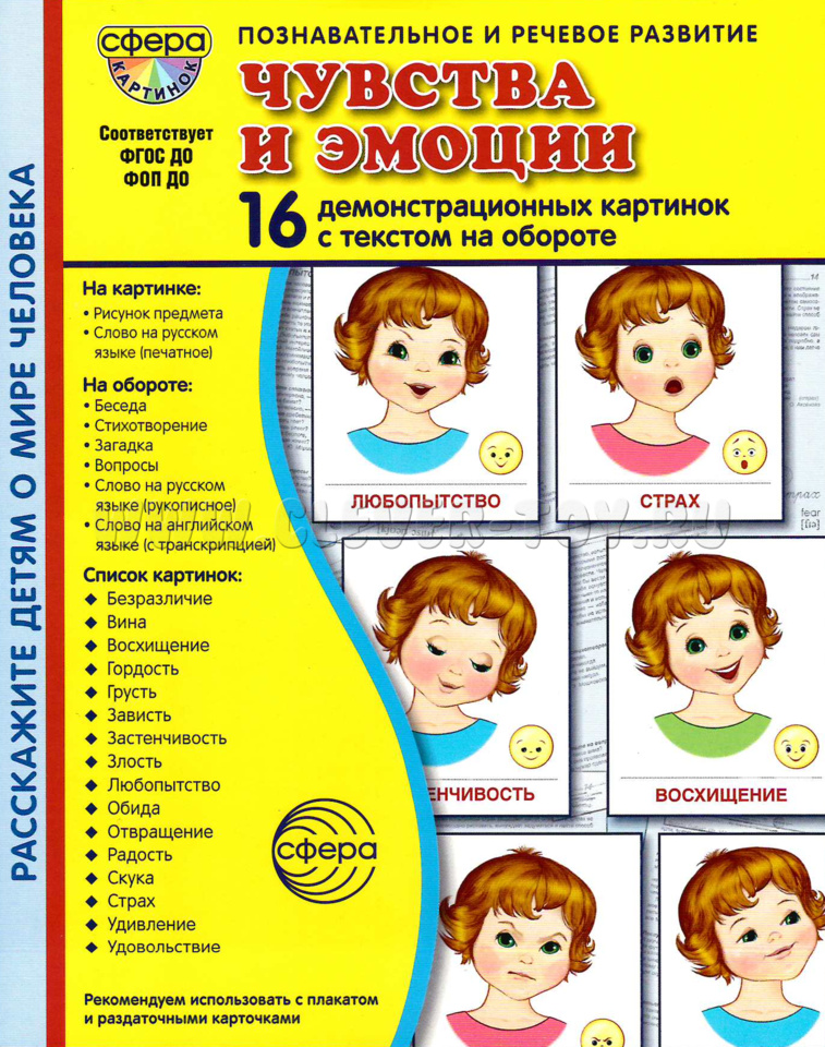 Лицевая сторона карточек украшена красочными иллюстрациями, изображающими различные эмоции человека: радость, грусть, удивление, страх, гнев и другие.