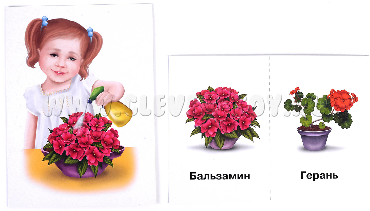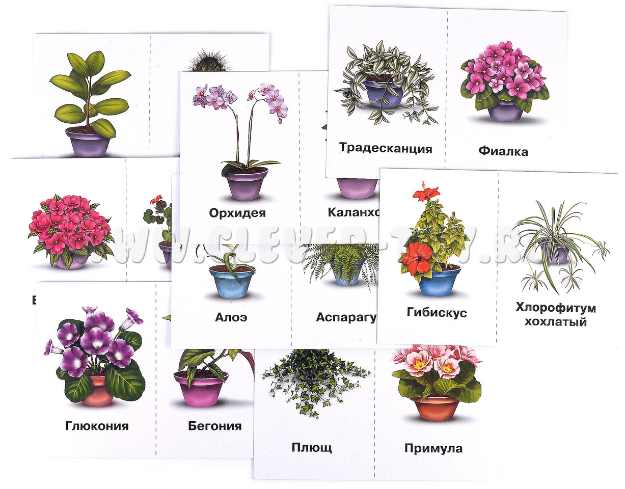 • 8 разрезных карт с цветами (фикус, кактус, бальзамин, герань, глюкония, бегония, алоэ, аспарагус, орхидея, каланхоэ, гибискус, хлорофитум, традесканция, фиалка, плющ, примула);