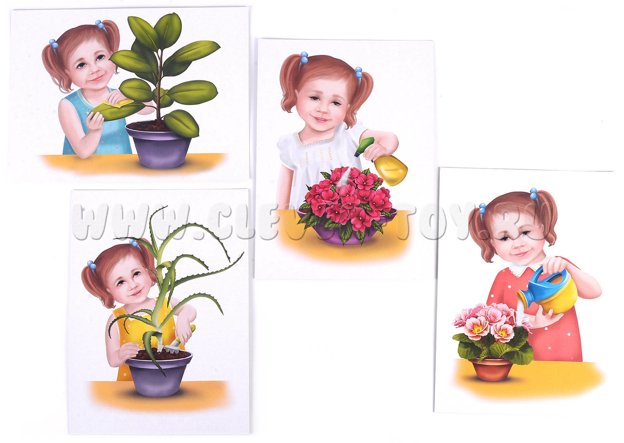• 4 карты с действиями по уходу (обтирать листья, рыхлить землю, опрыскивать листья, поливать).