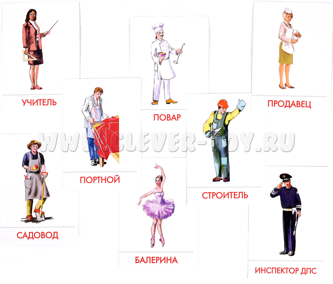 На карточках представлены: балерина, врач, портной, менеджер, инспектор дпс, парикмахер, повар, пожарный, продавец, журналист, садовод, строитель, водитель такси, учитель, фермер, художник.