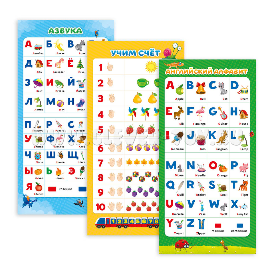 Сборник состоит из 9 обучающих плакатов, с помощью которых ребенок познакомится с буквами русского и английского алфавита, цифрами, животными, фруктами, овощами и ягодами, транспортом, профессиями и природными явлениями.
