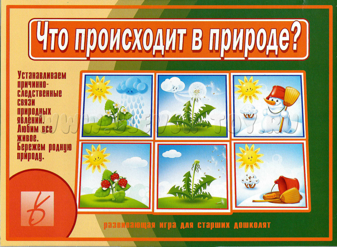 Перед вами игра для детей старшего дошкольного возраста. С её помощью дети познакомятся с природными явлениями, научатся устанавливать причинно-следственные связи, а также смогут развить связную речь и умение выражать свои мысли.
