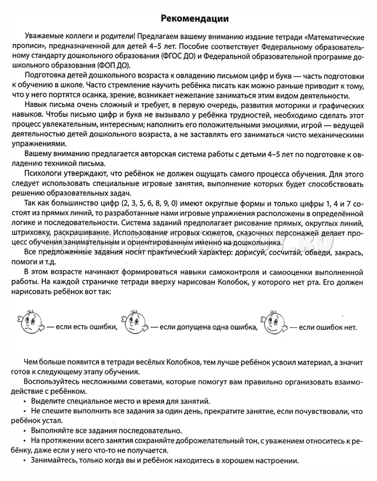 В возрасте 4 - 5 лет у детей начинают формироваться навыки самоконтроля и самооценки выполненной работы. На страницах тетради изображён смайлик Колобок без рта, который ребёнок должен нарисовать самостоятельно, оценив свою работу.