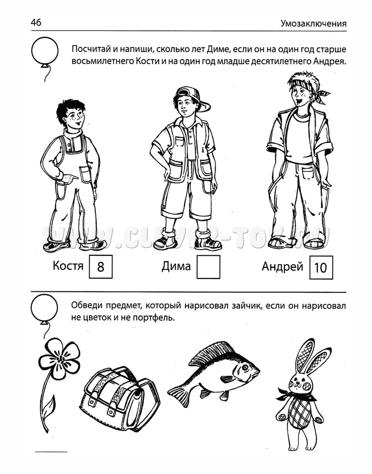 Они формулируются в виде конкретного действия с помощью глаголов: нарисуй, обведи и т.п.; имеют понятный результат, который ребёнок определяет с помощью критерия взрослого или по образцу. У него продолжают формироваться предпосылки учебной деятельности: понимание учебной задачи, самостоятельное решение и навык самоконтроля и самооценки. Логические задачи не требуют вычислений. Их решение направлено на поиск связей и отношений между отдельными предметами, явлениями, ситуациями.