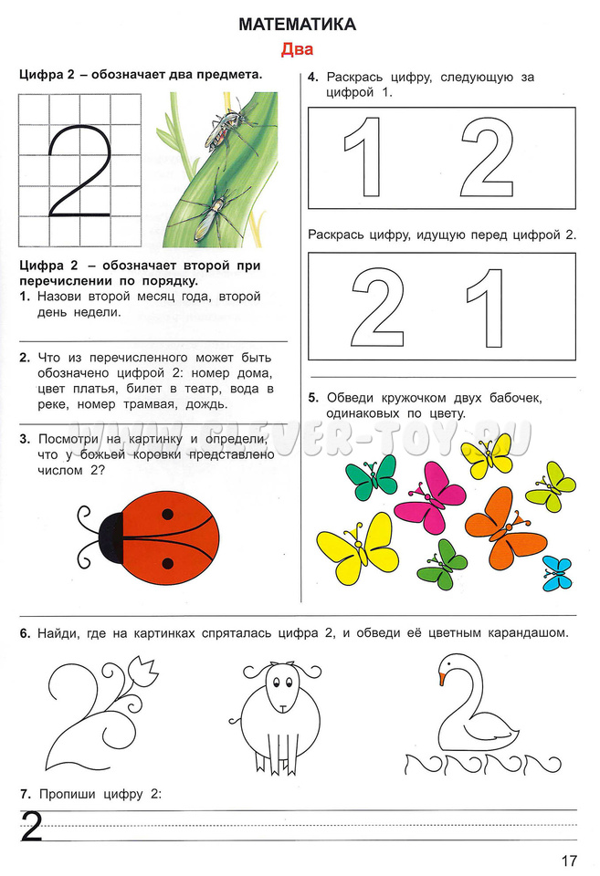 4. Математика (задача ребенка изучить цифру 2 и и выполнить 7 заданий).