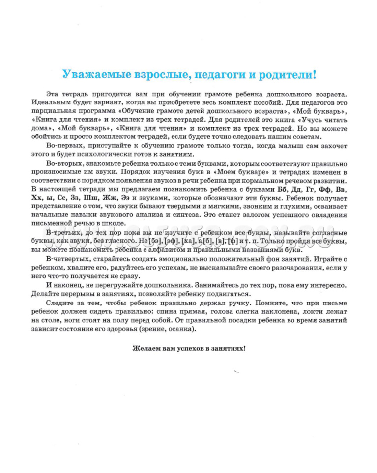 Буквы по частям набор расположены не по алфавиту, а в соответствии с порядком появлении звуков в речи ребенка. В этой тетради (Вторая часть) такие буквы: Б, Д, Г, Ф, В, Х, Ы, С, З, Ш, Ж, Э.