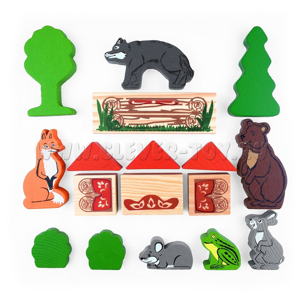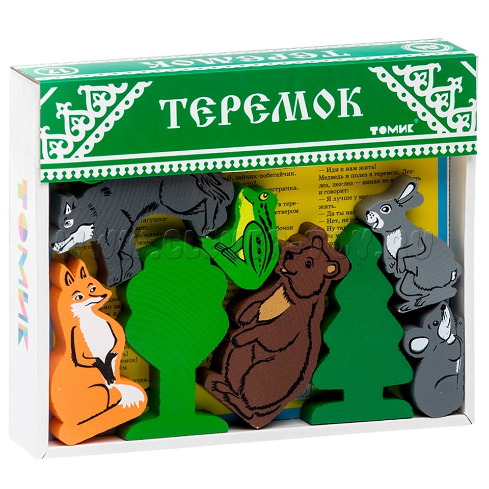В набор входят деревянные модели персонажей и декорации сказки "Теремок" (всего 17 деталей).