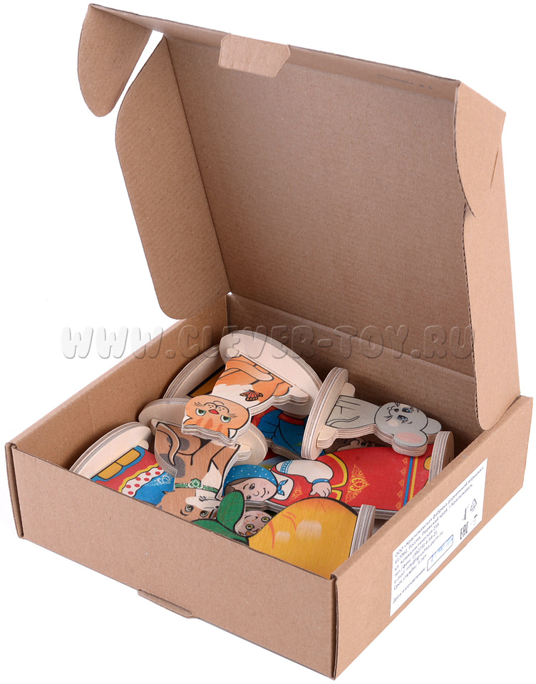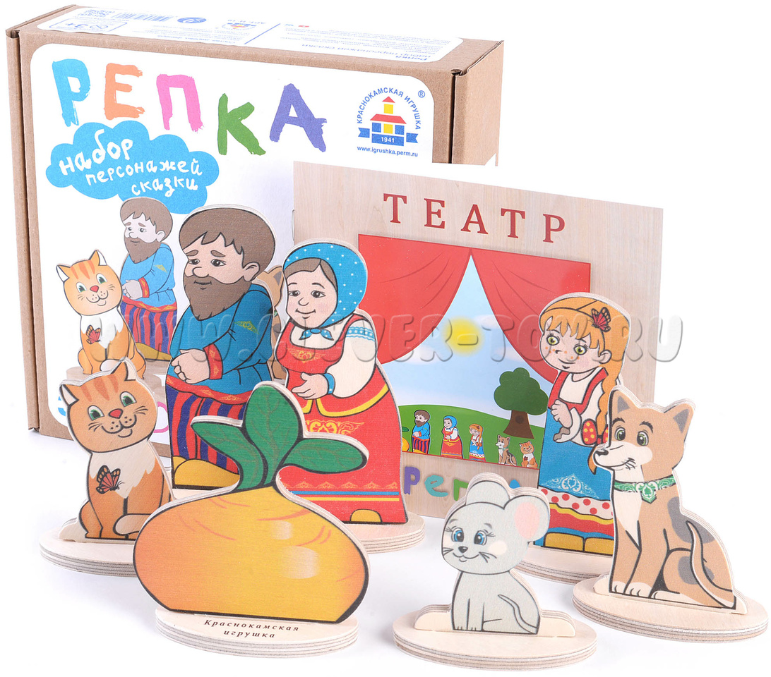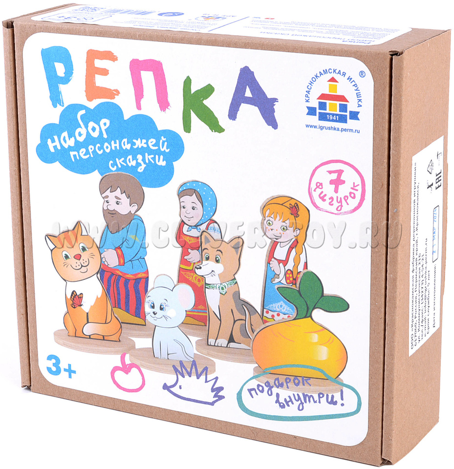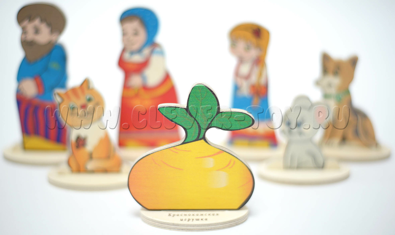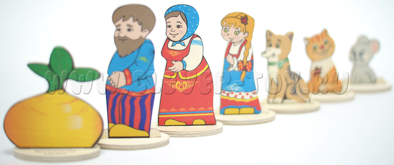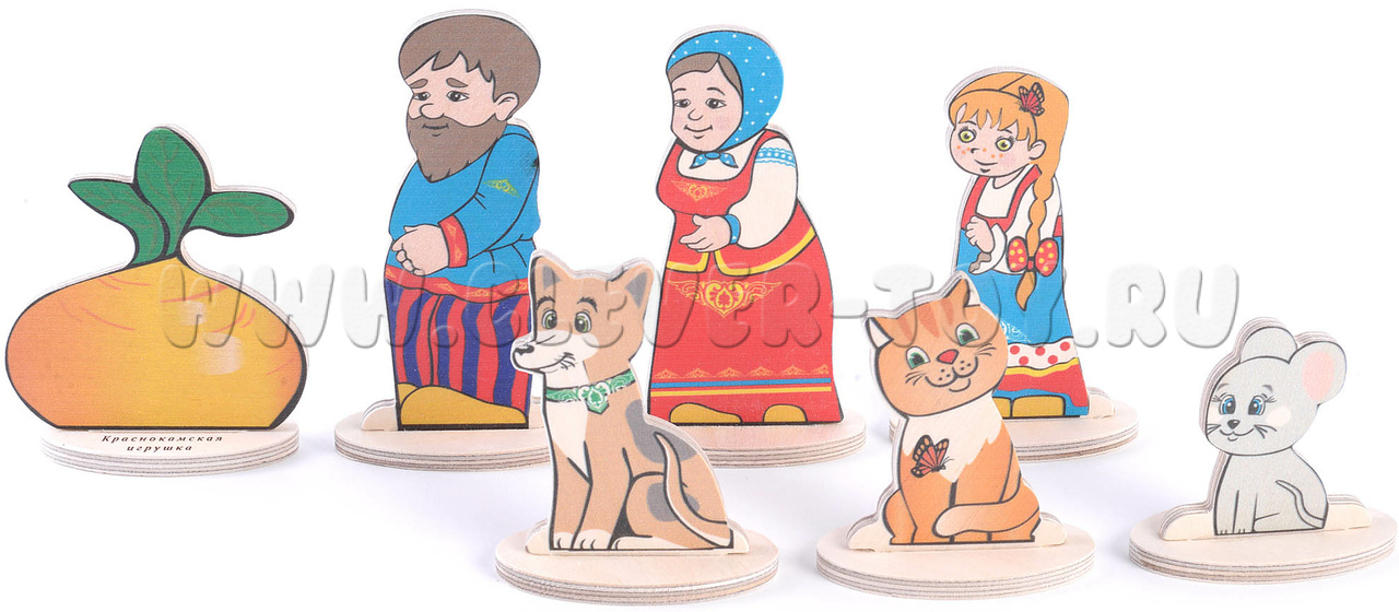 • 7 сказочных персонажей (Дед, Бабка, Внучка, Жучка, Кошка, Мышка, Репка) размером от 6 до 12 см.