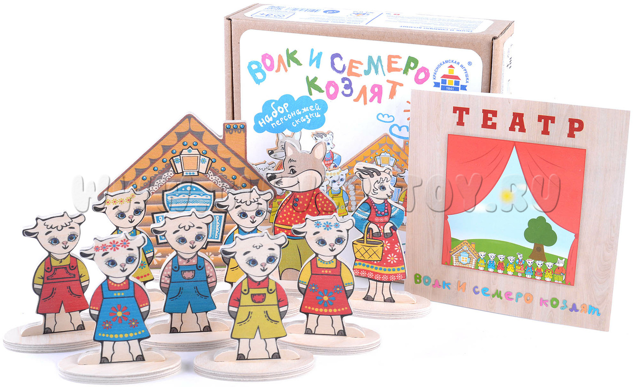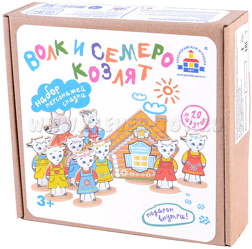 • 10 сказочных персонажей с подставками(7 козлят, Коза, Волк, Избушка) от 8 до 12 см.;