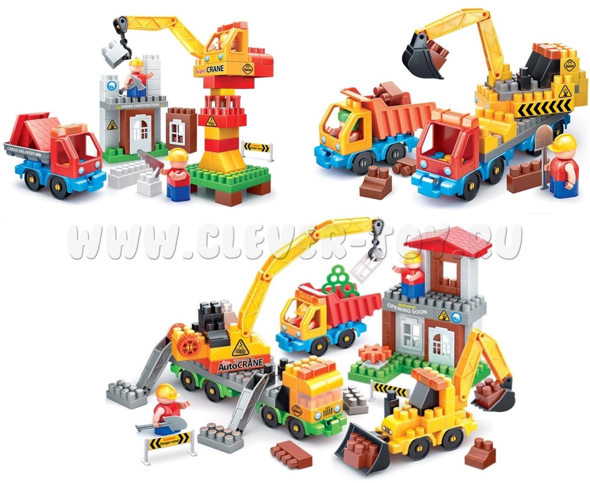 Набор серии «Стройка» совместим с другими наборами от BAUER. В комплект входят: кубики различных цветов и размеров, сборная строительная техника, сборные машинки, фигурки человечков и набор инструментов для них, набор наклеек "Дорожные знаки", элементы декора (дорожные знаки, деревья, светофоры, забор, окна, двери, крыши). Конструктор созданн из безопасного пластика с использованием пищевых красителей.