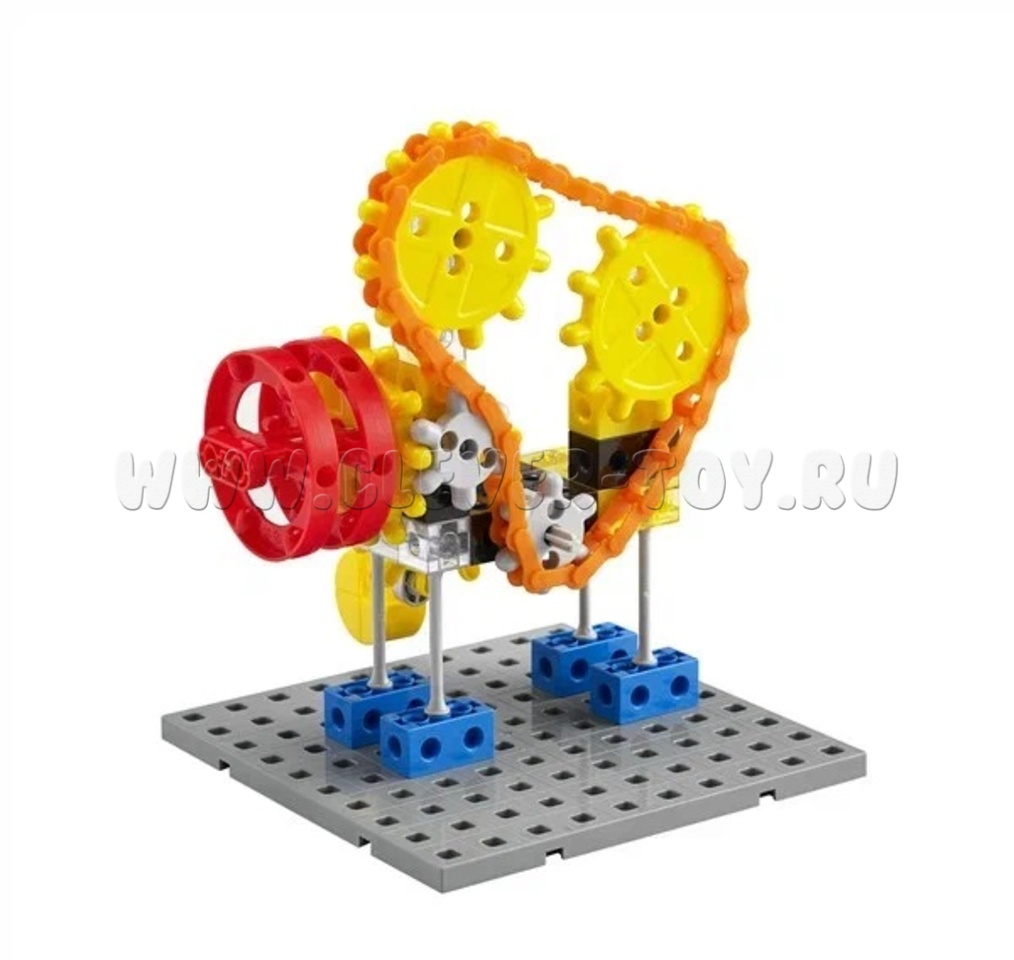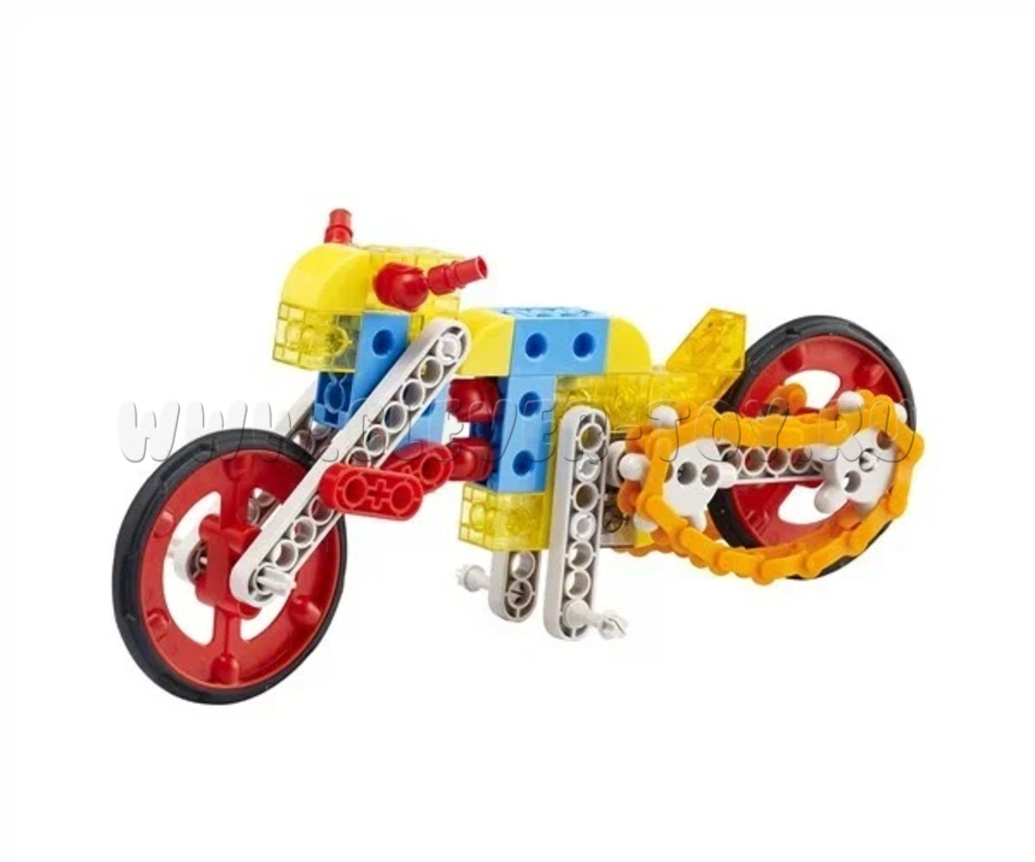 Набор включает в себя 181 деталь (шестеренки, колеса, оси, цепи, кубики, основание для кубиков и др.), а также инструкция на англ. яз. Размер самой длиной детали 9 см.