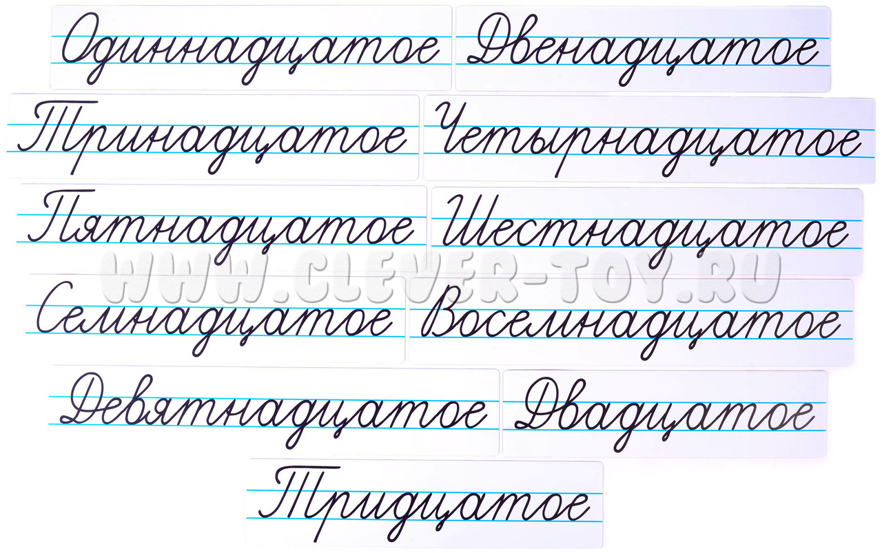 В комплект входят 32 карточки размером 9,5 см х 20-50 см. Высота букв 3 см.