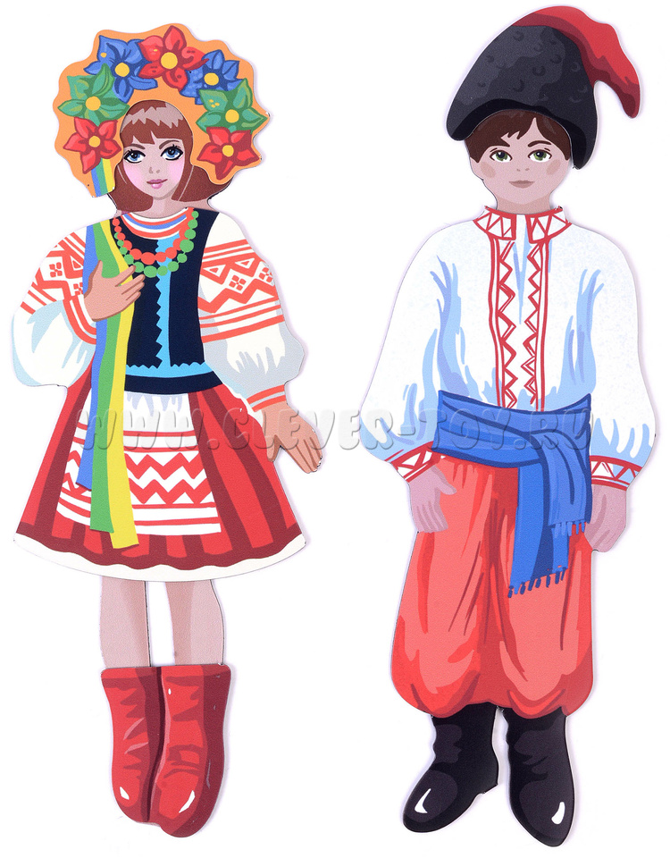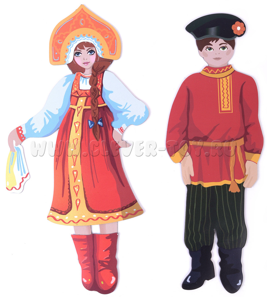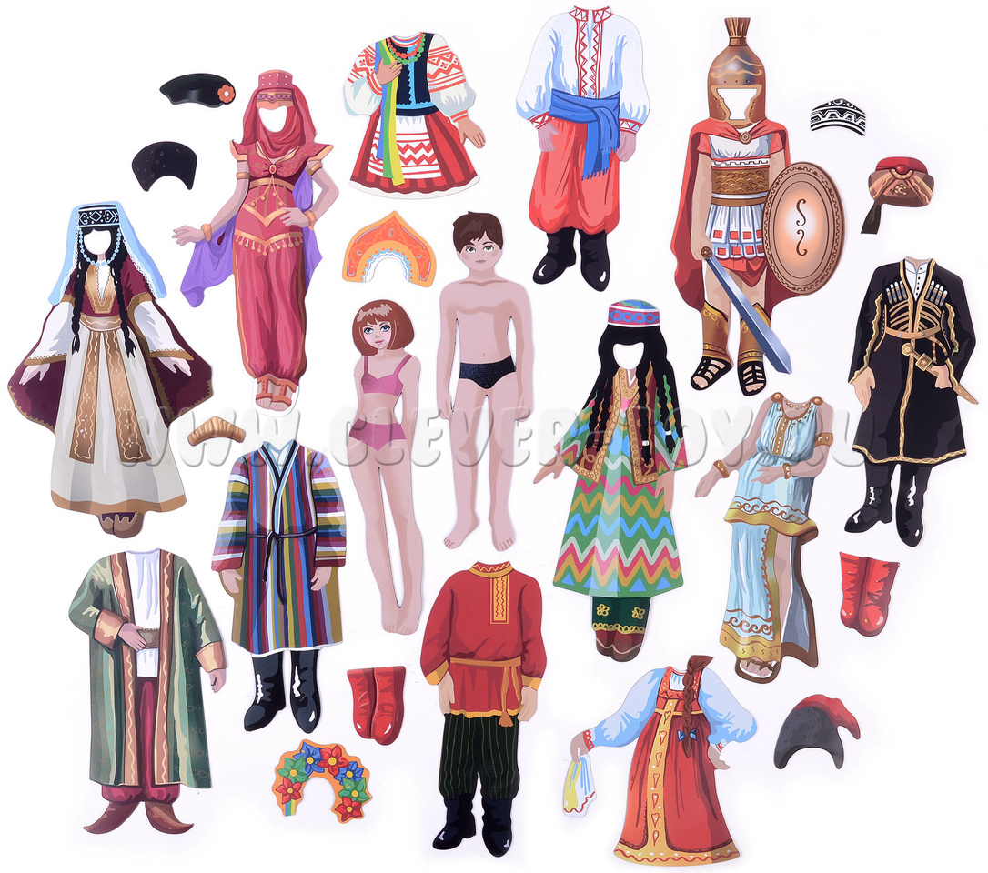 В наборе – магнитные мальчик и девочка в купальных костюмах (кстати, кукол можно крепить на магнитной доске) и шесть вариантов национальных костюмов: русского, украинского, грузинского, узбекского, греческого, арабского.