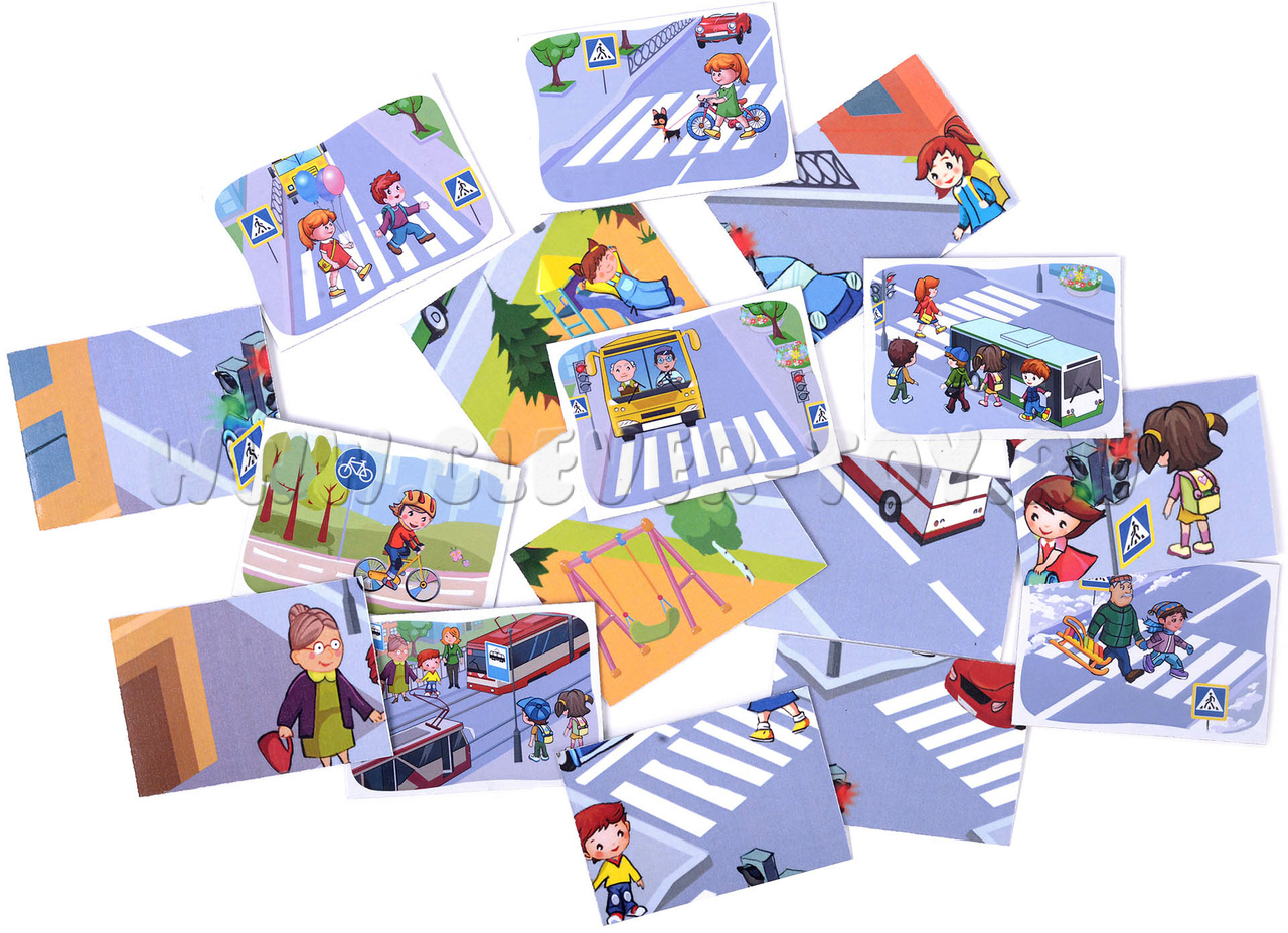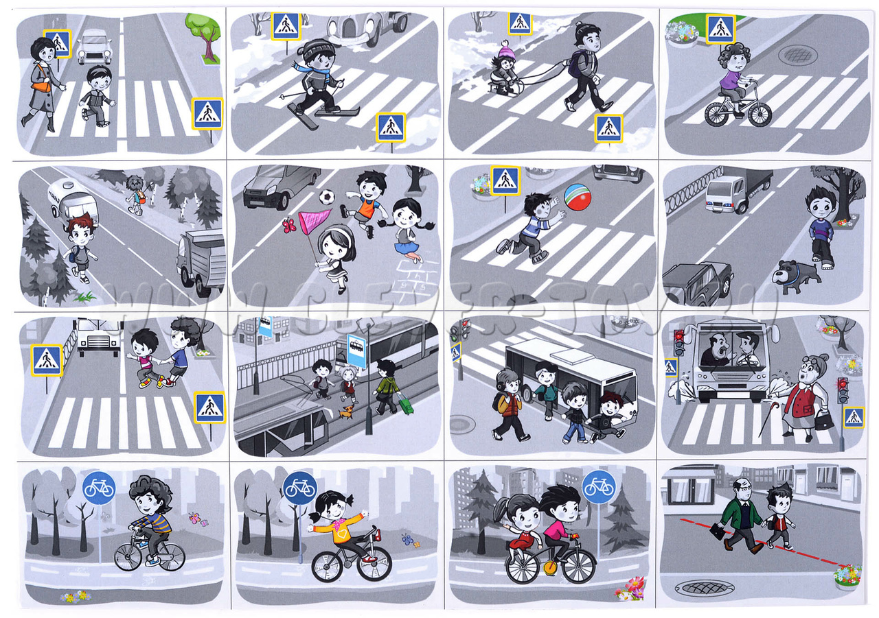 На цветных карточках изображены аналогичные сюжеты из жизни, только без ошибок. К каждой ситуации на черно-белом фоне надо подобрать цветную карточку по принципу "правильно - неправильно", положить ее "лицом" вниз на черно-белую и рассказать как надо вести себя на дороге.