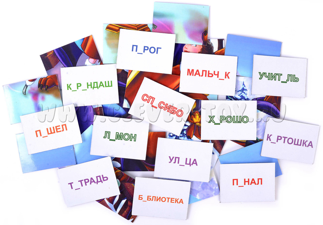 Как это работает? На игровом поле размещены разноцветные буквы с особым дизайном. Каждая карточка содержит слово с пропущенной буквой. Задача ребёнка — найти правильную букву и прикрепить к ней карточку.