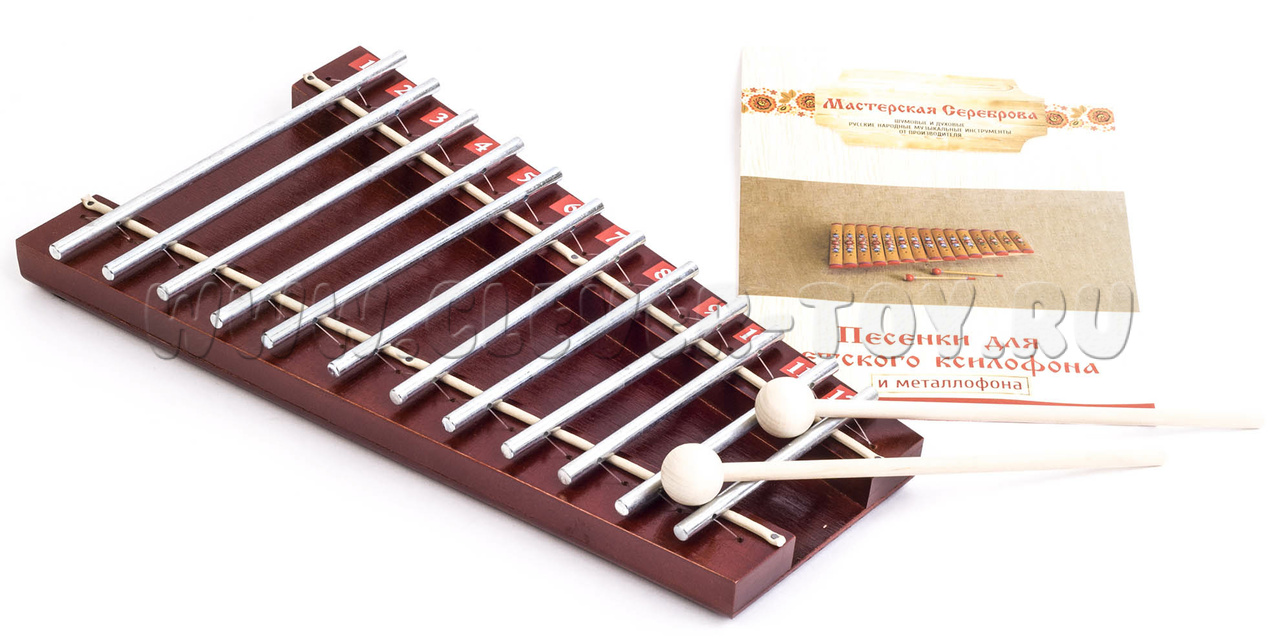 Металлофон изготовлен из 12 стальных прутков диаметром 6 мм, которые крепятся к резонатору. После закалки и гальванической обработки металл имеет мягкий, певучий и благозвучный голос.