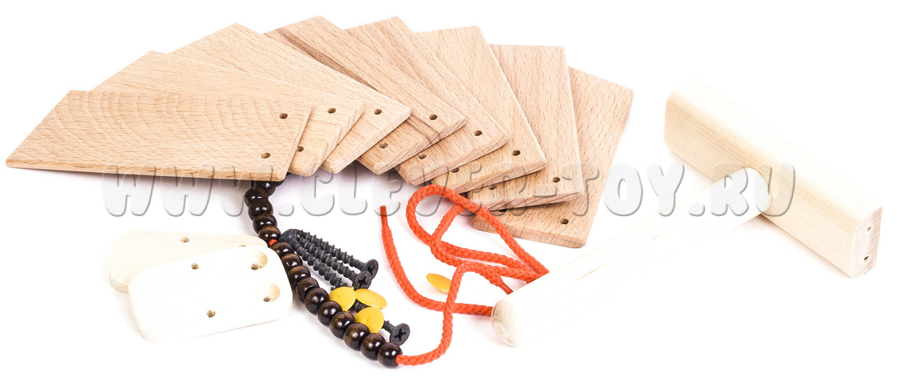 • Пластичная трещотка на ручке - состоит из 8 пластин, соединенных нитью и прикрепленных к деревянному основанию;