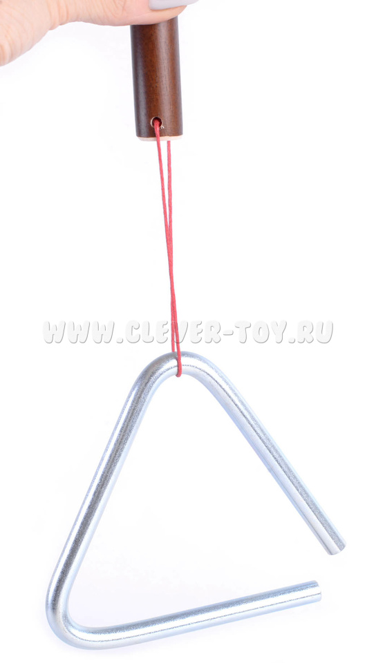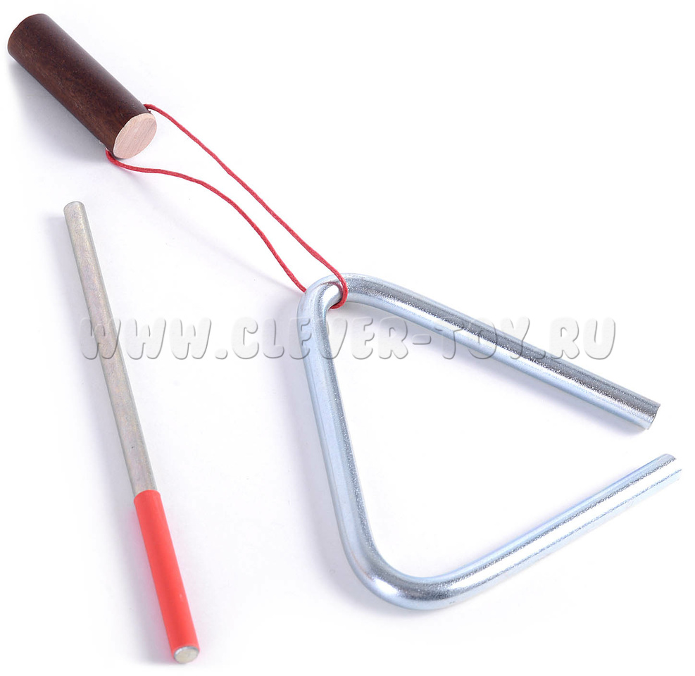 Треугольник выполнен из стали диаметром 8мм, длина стороны - 10см. Гальваническое покрытие не ухудшает качество звука и не разрушается при механическом воздействии. Ударная палочка из нержавеющей стали.