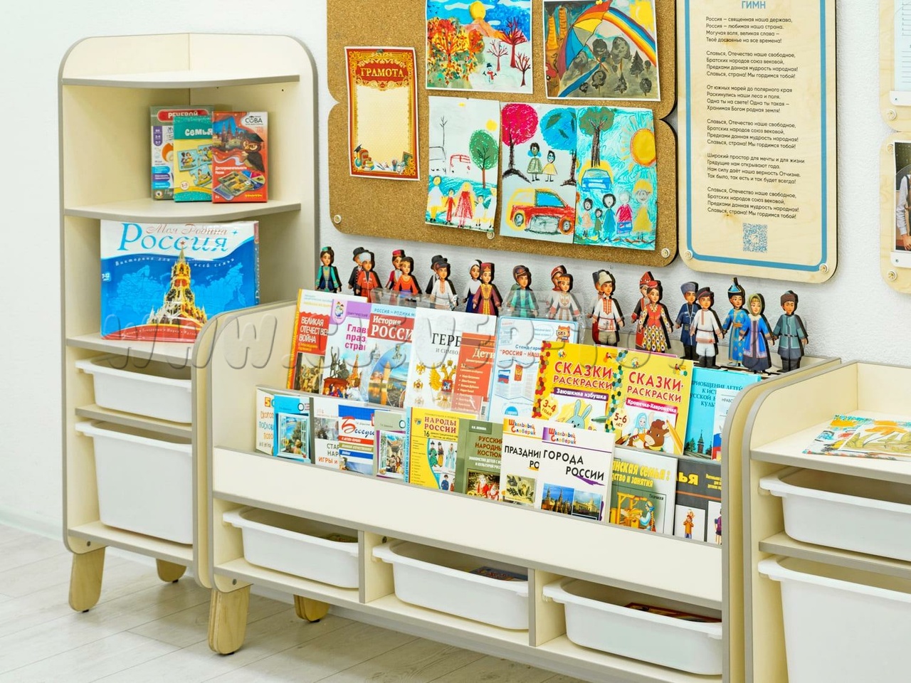 Уголок по патриотическому воспитанию для группы детского сада. Содержит основную символику РФ, панели для размещения работ воспитанников, набор разборных кукол, контейнеры для размещения книг. Соответствует требованиям ФГОС 3.
