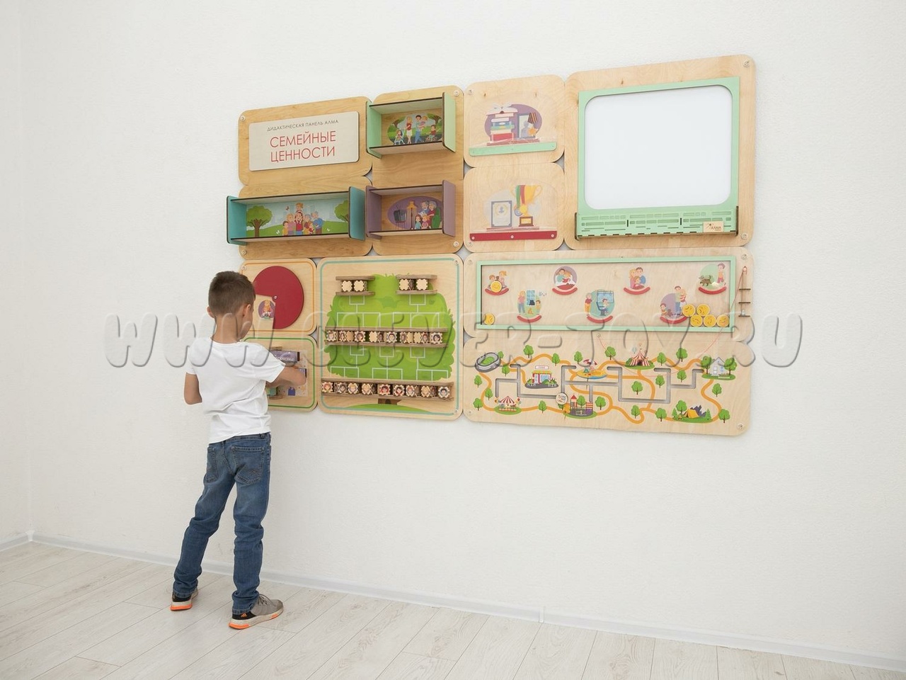 Элементы игровой настенной панели включают иллюстрации, развивающие игры и познавательные задания, которые отражают семейные ценности. Содержание блоков направлено на формирование у дошкольников любви к членам своей семьи, изучение истории своего рода, уважение представителей разных поколений, а также на создание и активное участие в семейных традициях и праздниках.