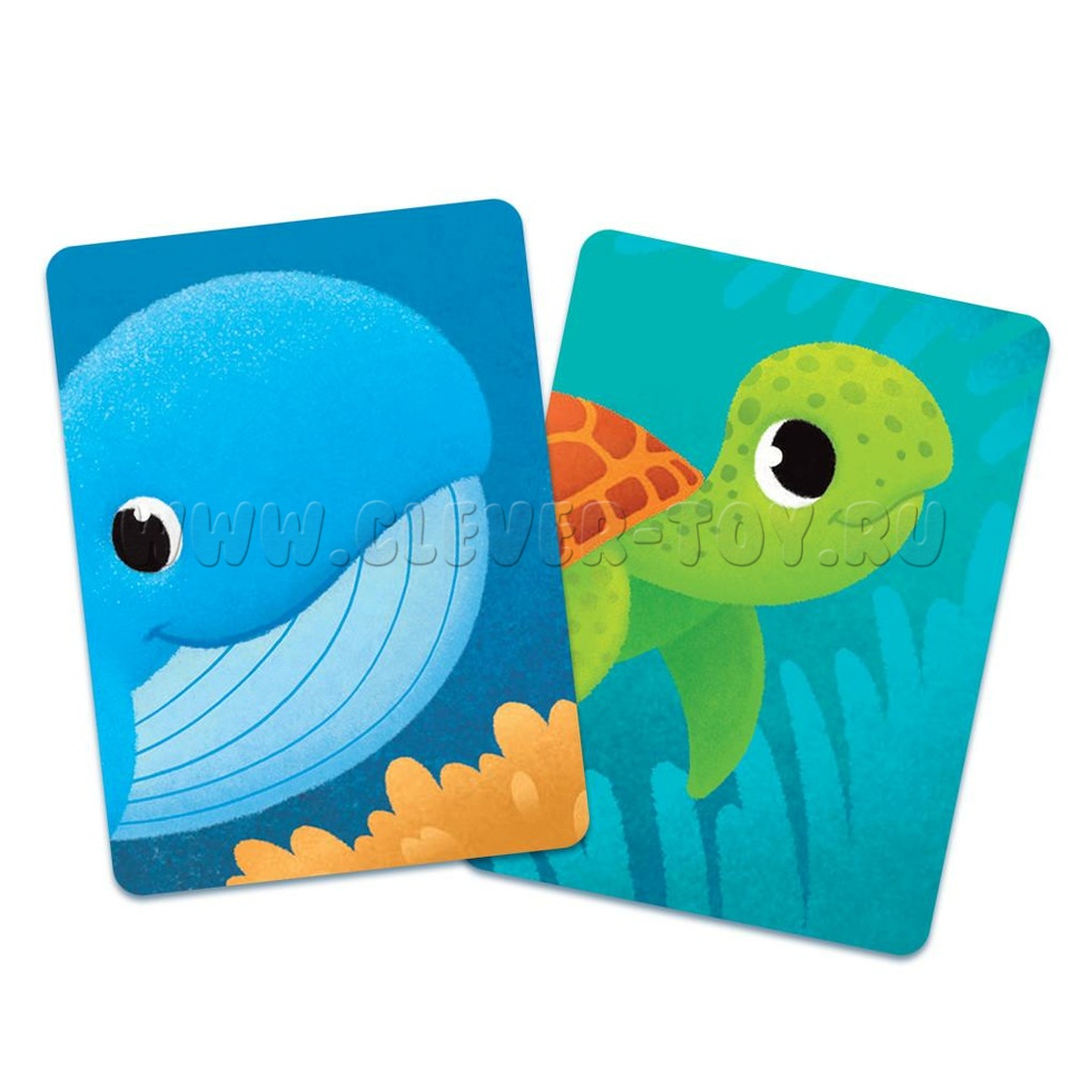 - 30 карточек с изображением представителей водной стихии, всего в колоде 15 пар карточек, каждая из которых должна составить целое морское животное;